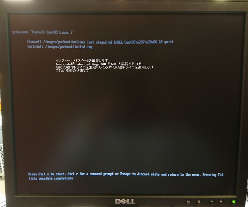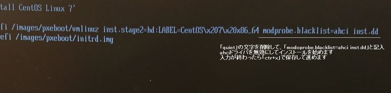 一行目の末尾の「quiet」を削除し、「modprobe.blacklist=ahci」「inst.dd」と入力します