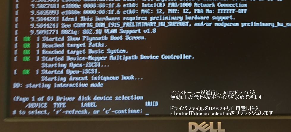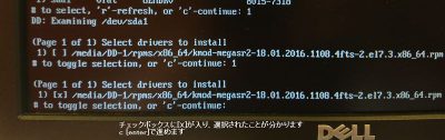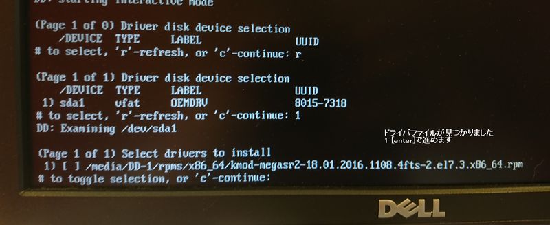 この画面まで進んだらドライバUSBを挿入してから、r [enter]を押下して読み込んでください。