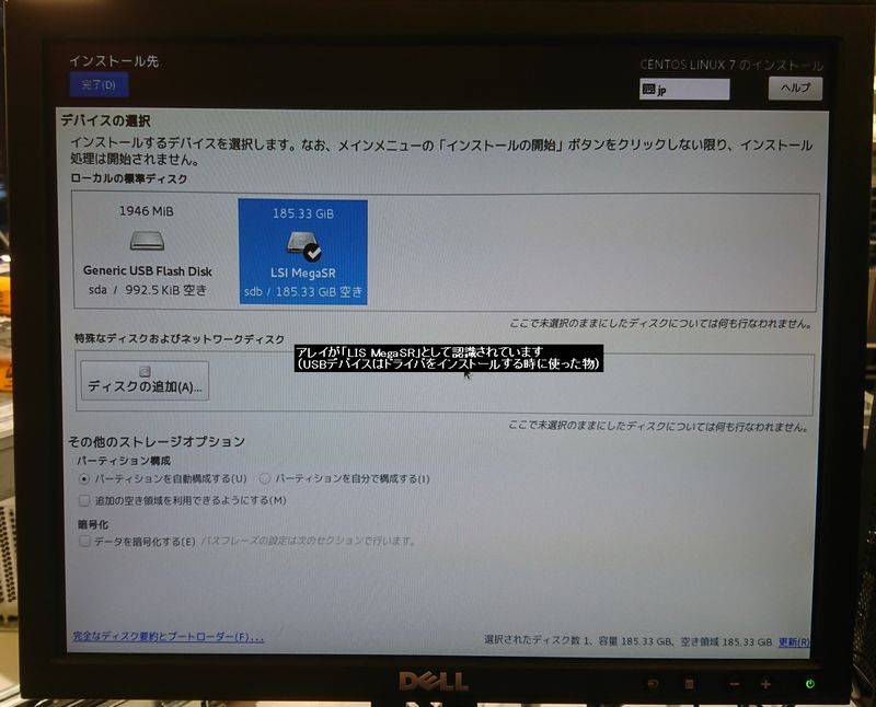 Embedded MegaRAID SATAのドライバUSBは前もって用意しておいてください。