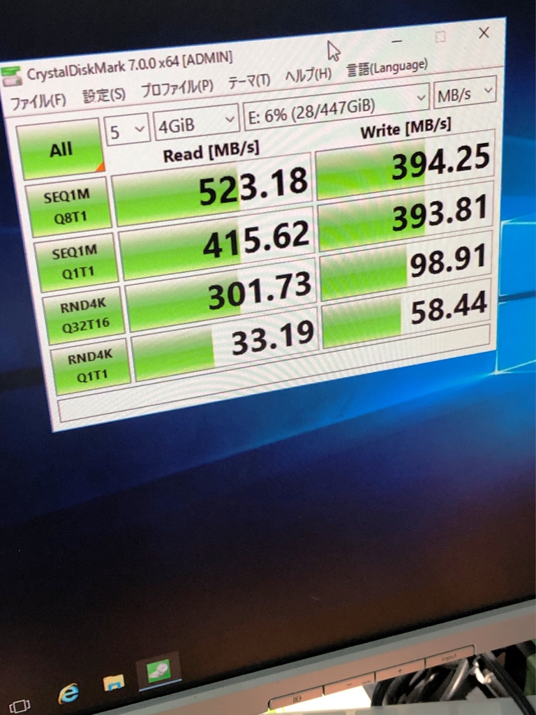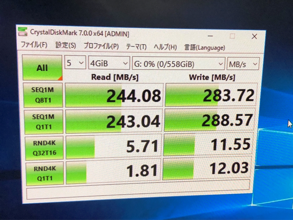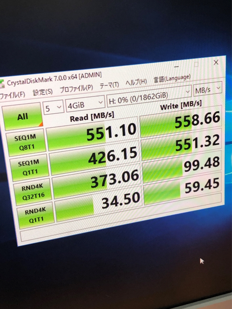 フォーマットを実施後、Crystal Disk Markにてパフォーマンスのチェックを行いました。