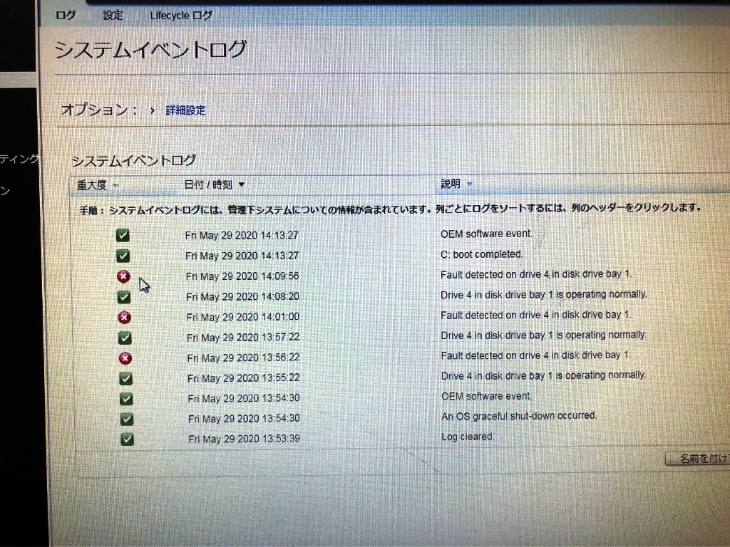 しかし、iDRAC上で確認してみますとログではエラー表記が発生し、ストレージの項目では出ておりません。