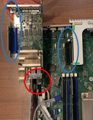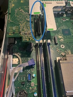 次に、ライザーカード側のPCIeをシステムボード側のPCIeスロットに差し込みます。(青円部分)