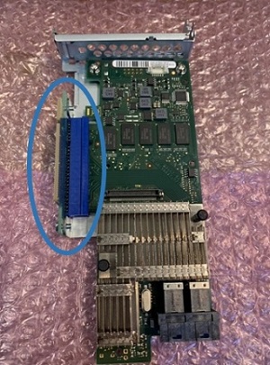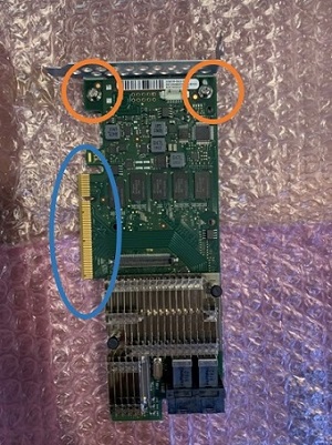 箱から取り出したRAIDカードに、ロープロファイルブラケットをネジ止めします。(橙円部分)