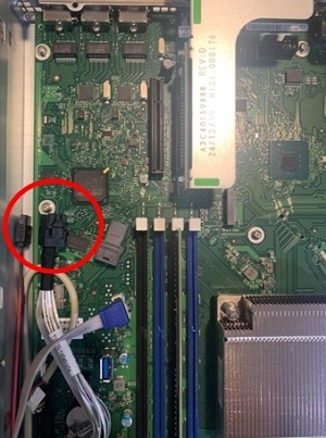 SATAケーブルを抜き取り、RAIDカード側の1のポートに挿し込みます。(赤円部分)