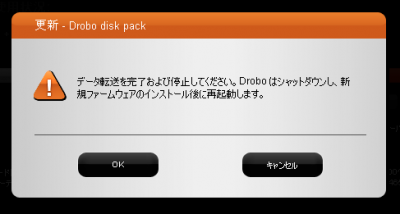2.「データ転送を完了および停止してください…」と表示されるので、もし Drobo からファイルのコピー等を行っているようであれば、ここで中断してください。そして OK をクリックします。