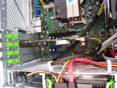 RAIDカード(富士通純正 6Gb 512Mキャッシュモデル)をPCI-Eに取り付け、SAS対応ケーブルでMB994SP-4Sの4つのコネクタと接続します。