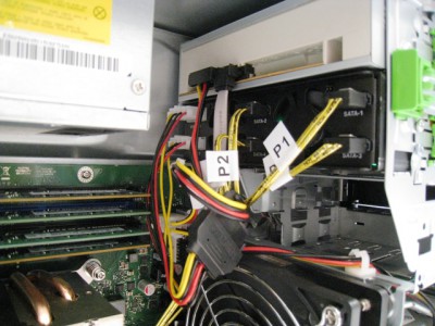 TX100S3は昔の白い電源コネクタを搭載しておりません。そこでSATAの電源を変換するケーブルを用いてMB994SP-4Sへ電源供給します。