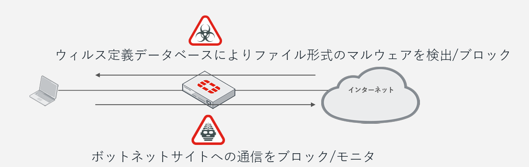 Fortinet社開発Engine/Signatureを使用し、SMTP、POP3、FTP、IMAP、HTTP/HTTPSなどのプロトコルに対応。