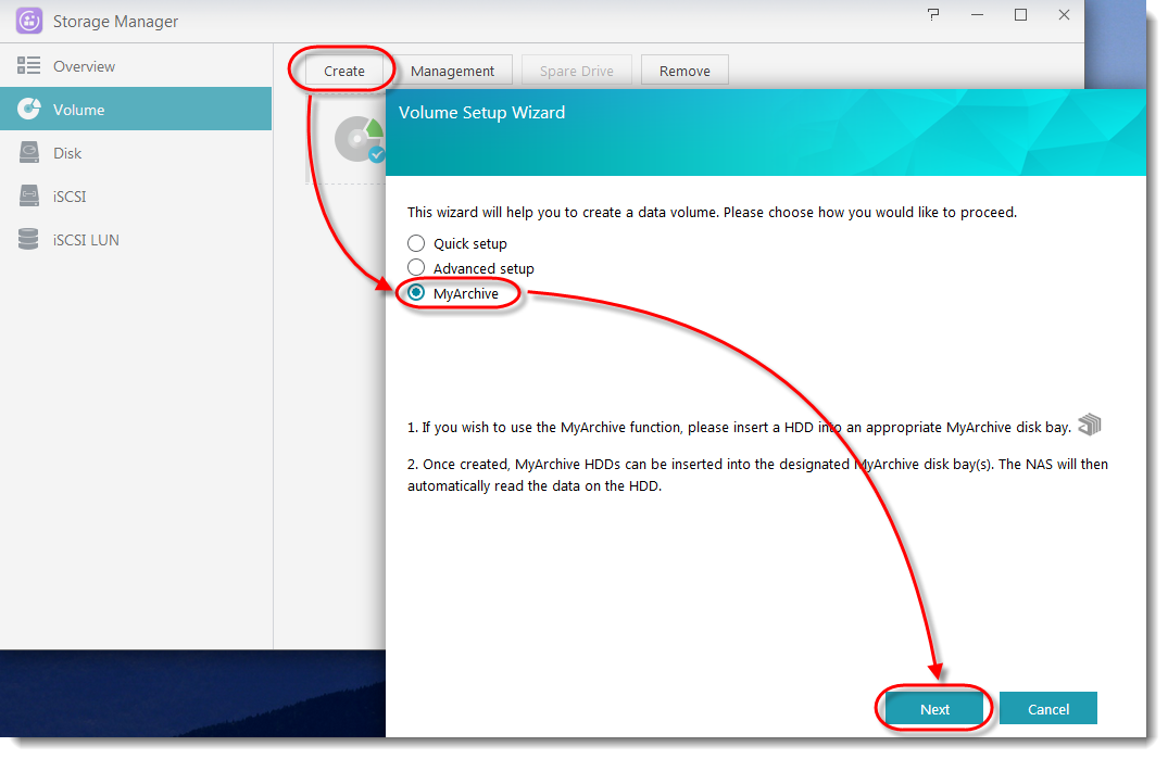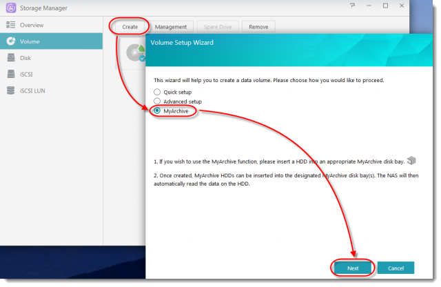 - ボリュームセットアップウィザードが表示されます。 [MyArchive]ラジオボタンを選択します。