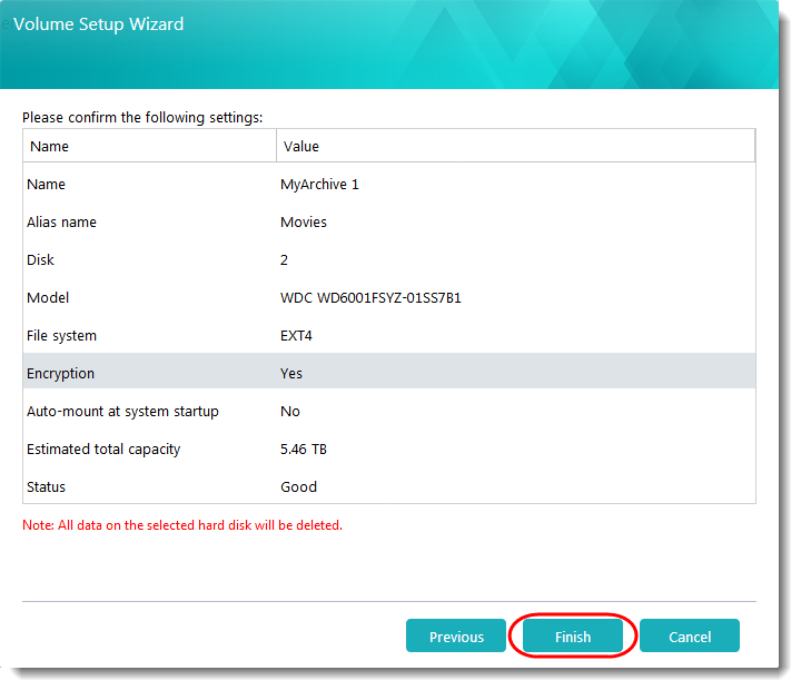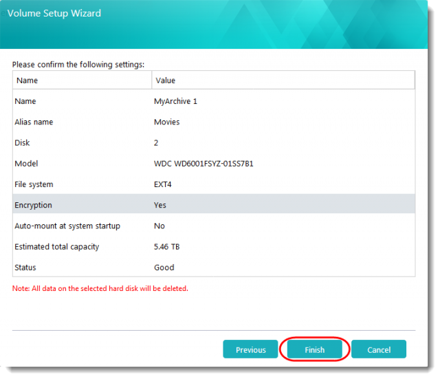 (注記:MyArchiveハードディスクを作成するハードディスクに保存されているすべてのデータが削除されます。 ハードディスクにデータが残っている場合、バックアップを作成してください。) - [次へ]をクリックし、残りの手順を進め、MyArchiveハードディスクを作成します。
