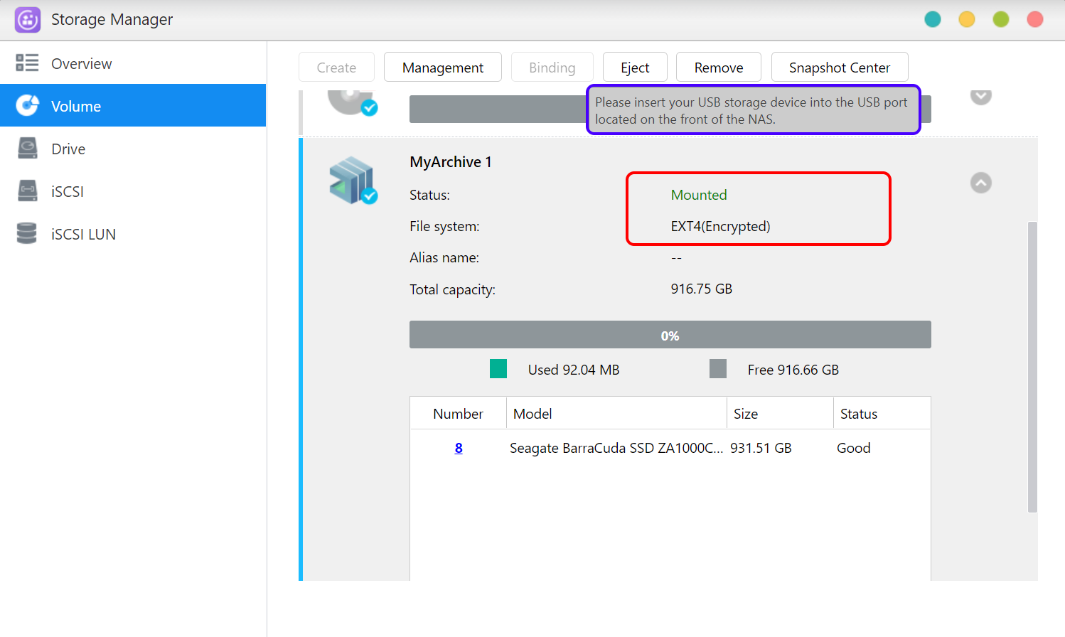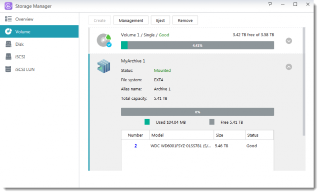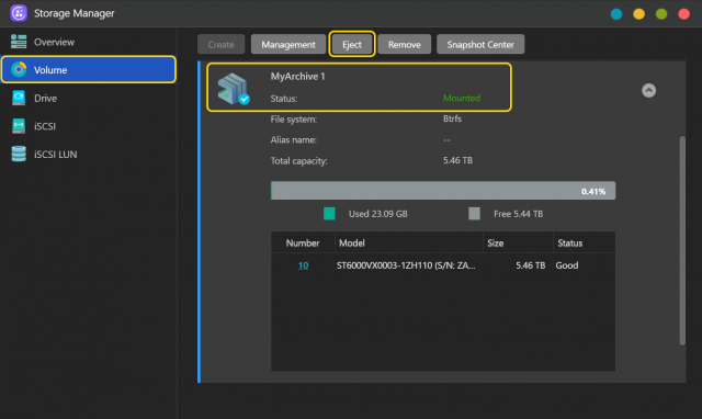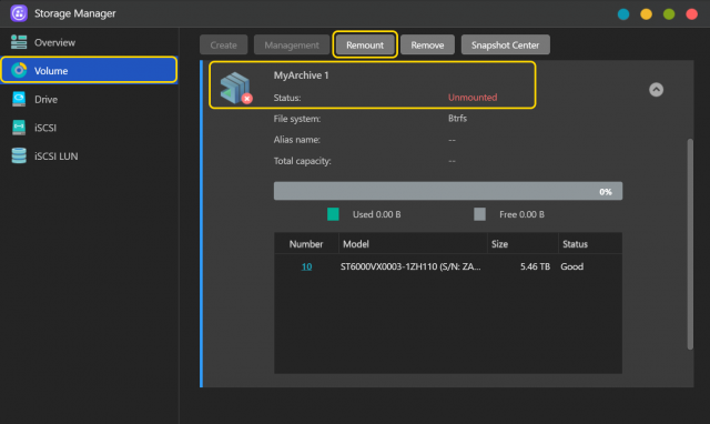 - 「ストレージマネージャ」→「ボリューム」を選択し、EXT4 または Btrfs の MyArchive ハードドライブがマウントされていることを確認してから。