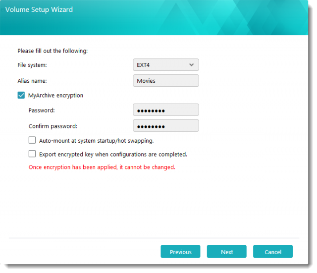 - MyArchiveディスクの「ファイルシステム」を選択します。例:EXT4、Btrfs、NTFS、exFAT*、HFS+のいずれか。