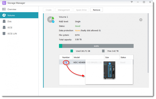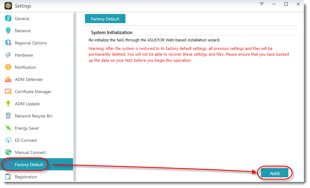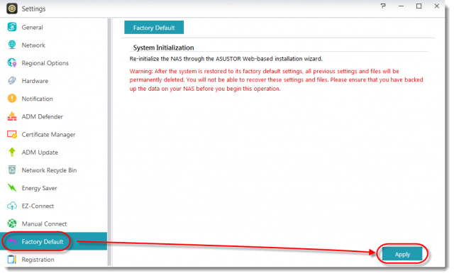 NASを再初期化する前に、ボリューム1のデータがすべてバックアップされていることを確認してください。 以下の手順に従い、NASを再初期化します。
