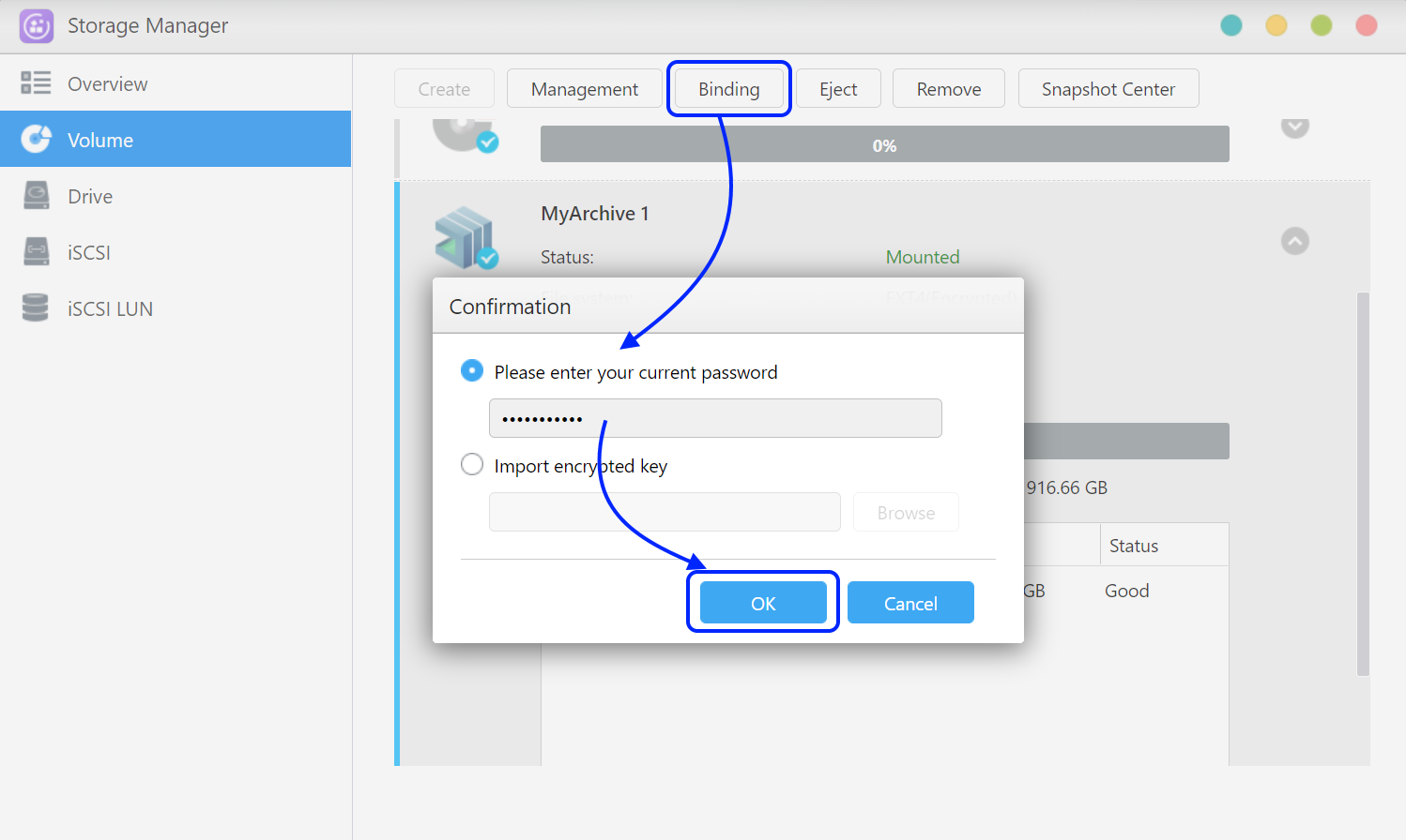 - 「バインディング」ボタンをクリックし、パスワードを入力するか、暗号化キーをインポートし、「OK」をクリックします。