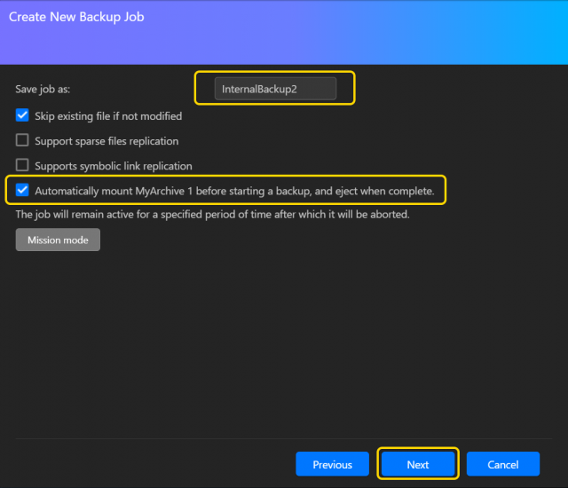 - バックアップ時間になると、MyArchive 1が自動的にマウントされ、バックアップの完了後に自動的に終了します:この機能を有効にすると、ADMはバックアップ開始時に接続されたMyArchiveドライブを自動的にマウントし、完了時にMyArchiveドライブを自動的に取り出します。