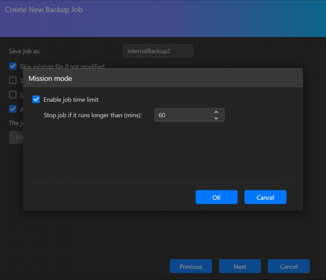 - ミッション モード:ASUSTOR の内部バックアップ用のミッション モード オプションでは、バックアップ ジョブをアクティブにしておく時間を設定できます。その時間の経過後、開始されない場合は中断されます。