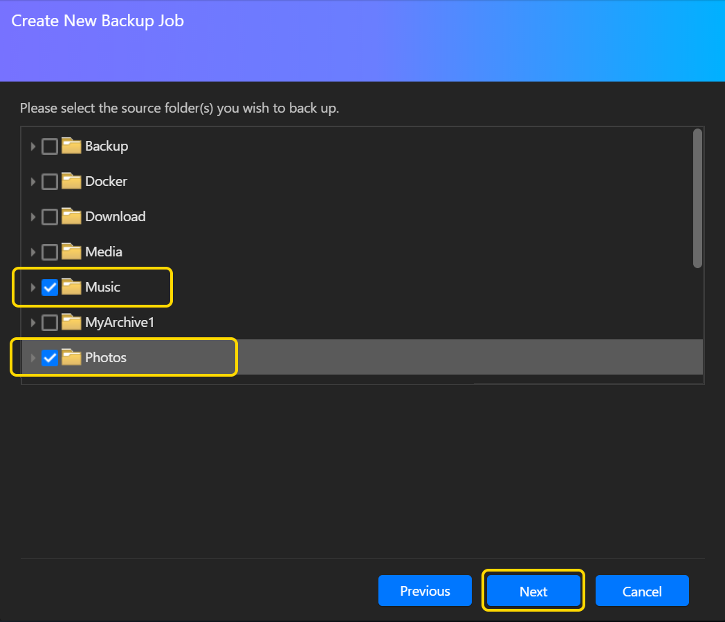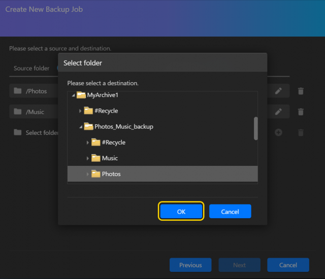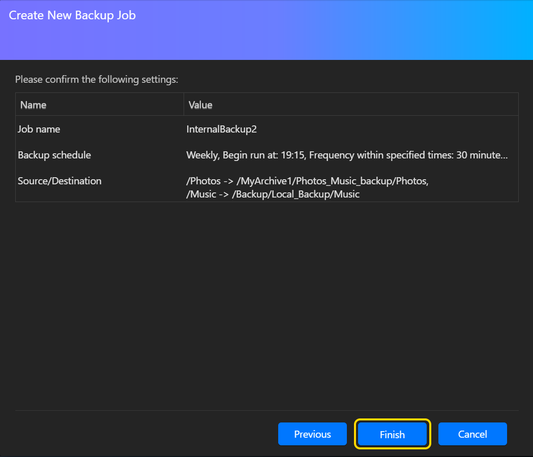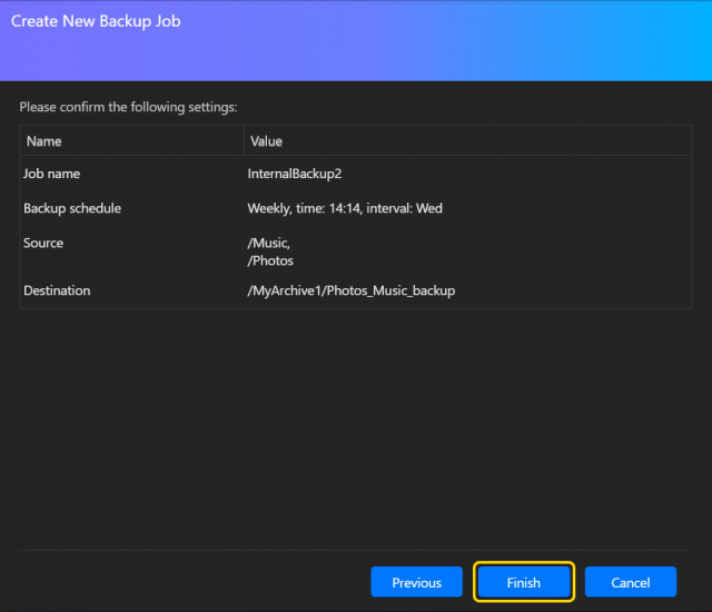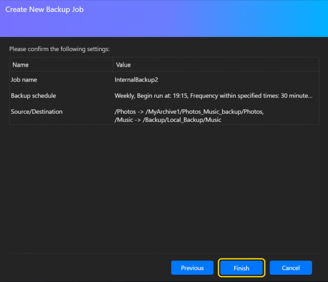 このセクションでは、ASUSTOR NAS データを MyArchive ハードドライブにバックアップするためにバックアップジョブを作成し、実行することにします。