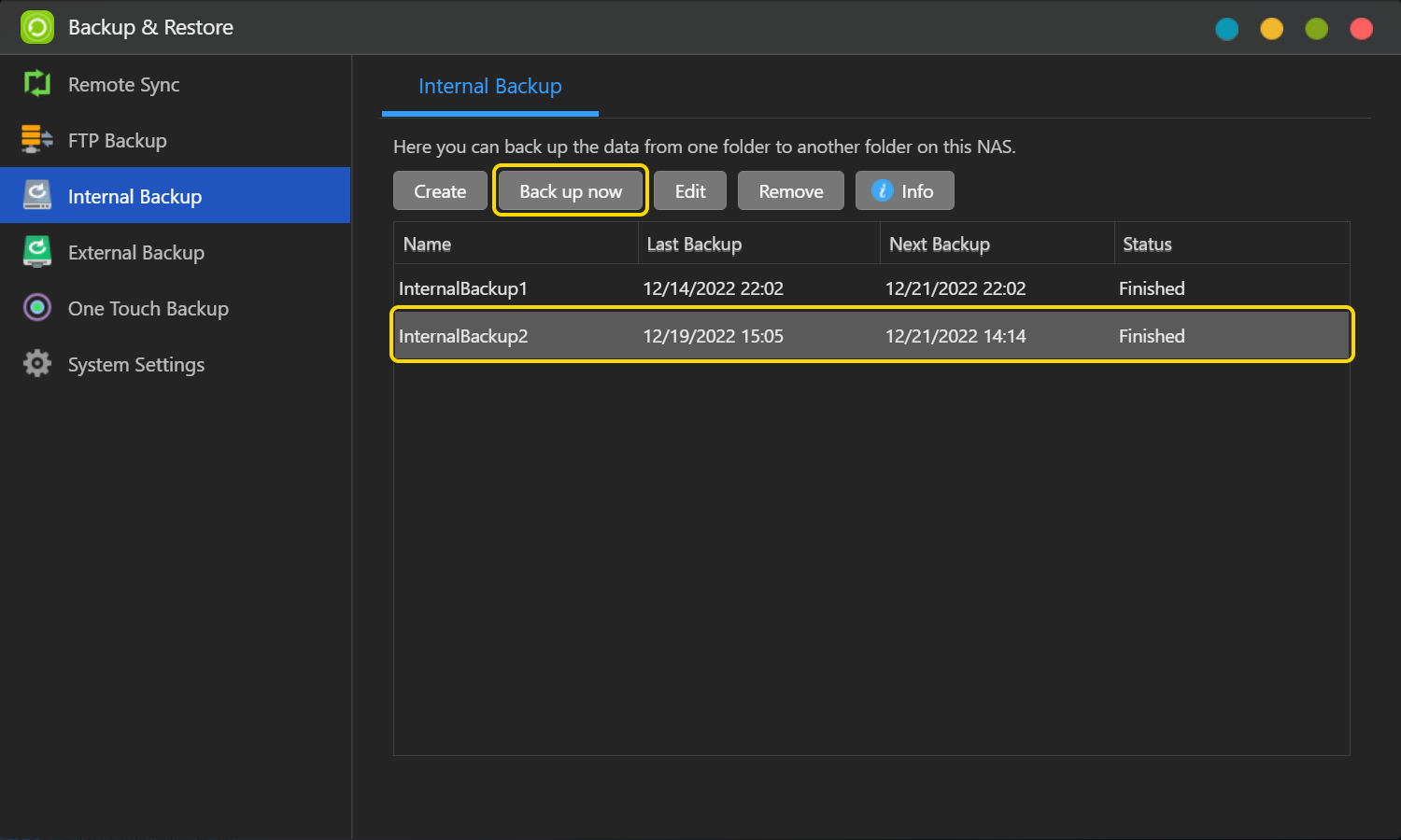 - [内部バックアップ]タブの下で作成したジョブが表示されます。 作成したジョブを選択してから、[今バックアップする]をクリックしてバックアップジョブを実行します。