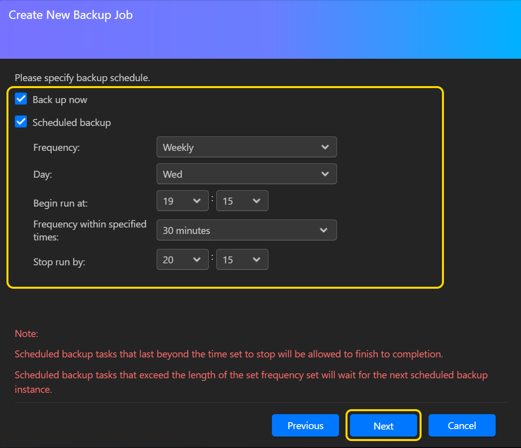 - これらのオプションは、即時バックアップと定期バックアップの両方を可能にします。両方を選択できます。