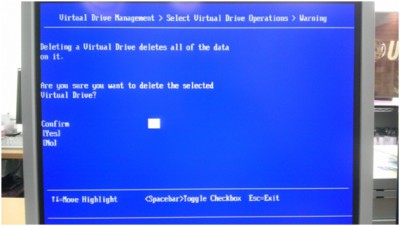 以下の画面から、Delete Virtual Driveを選択し、本当に消去するか確認画面が表示されますので、Confirmにスペースキーでチェックを入れ、YesでEnterを押すことでRAID情報が消去されます。