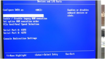 次に、ServerRAID C100をDisableにし、AHCIモードでのインストールを試してみました。uEFIのメニューからSystem Settings→Devaices and I/O Portsを選択し、「Configure SATA as」でAHCIを選択し、設定をSaveしてuEFI Settingsを抜けます。