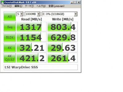 そこで今回は、LSI Nytro WarpDrive WLP4-200を使用してみました。簡単に言うと、SLCのSSDをPCI-eカードに搭載してストレージ化した商品です。詳しくはLSIのサイト等でご確認ください。このカードをPrimergy RX300S7へ搭載してどのようなパフォーマンスが出るか検証してみました。
